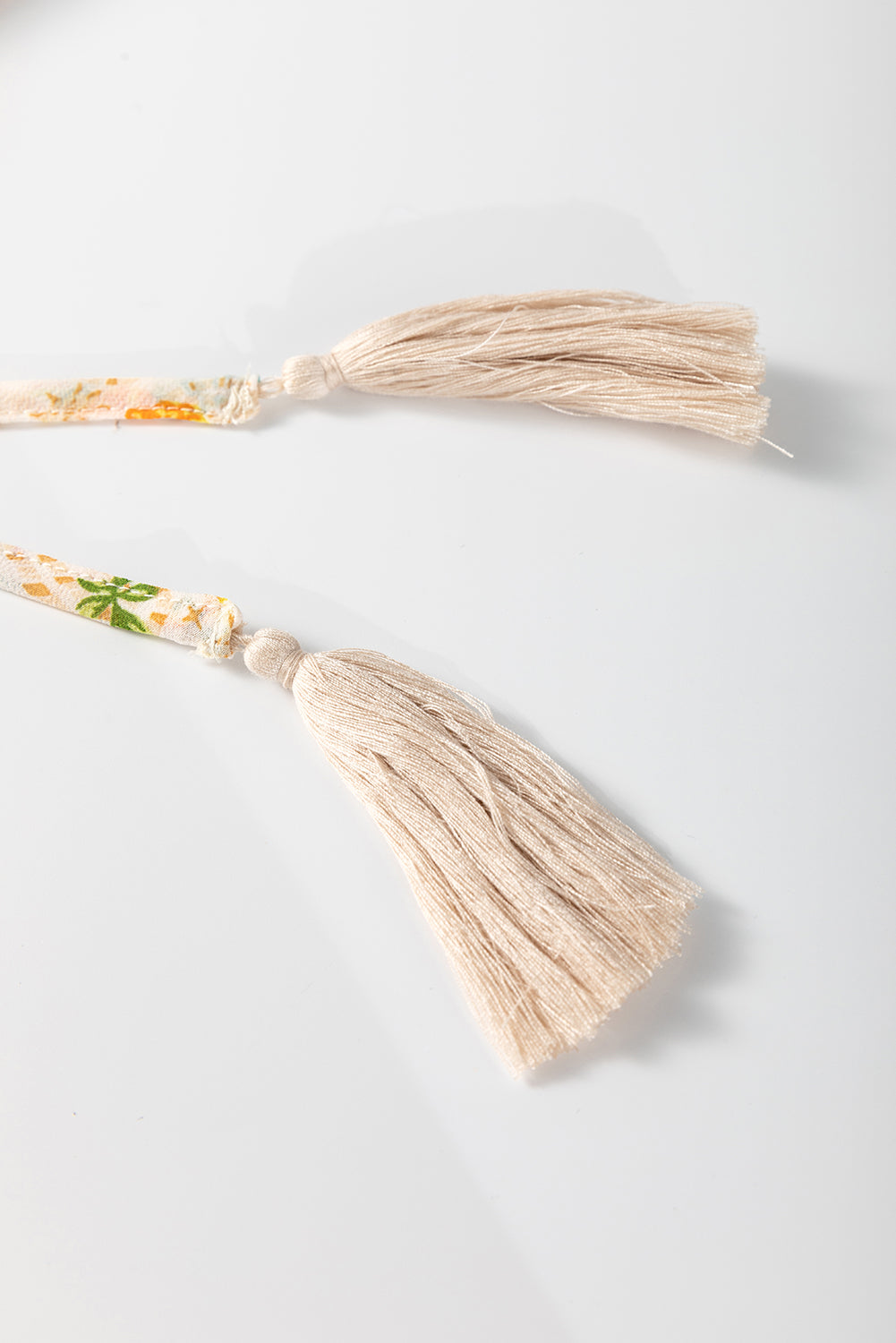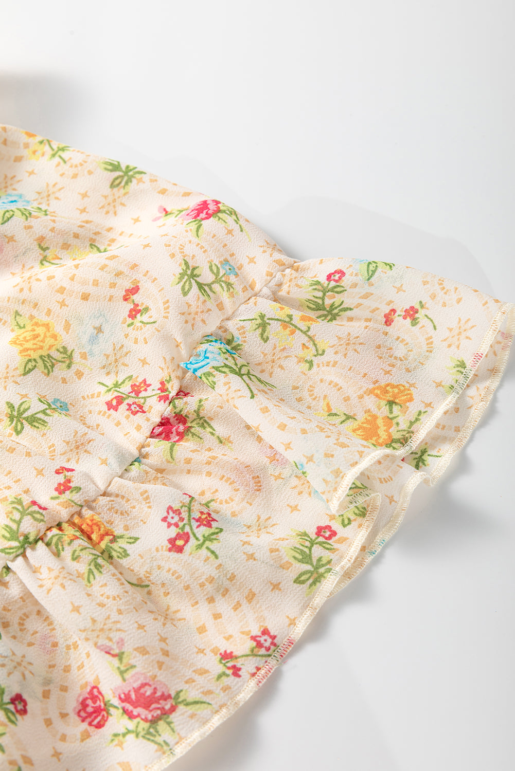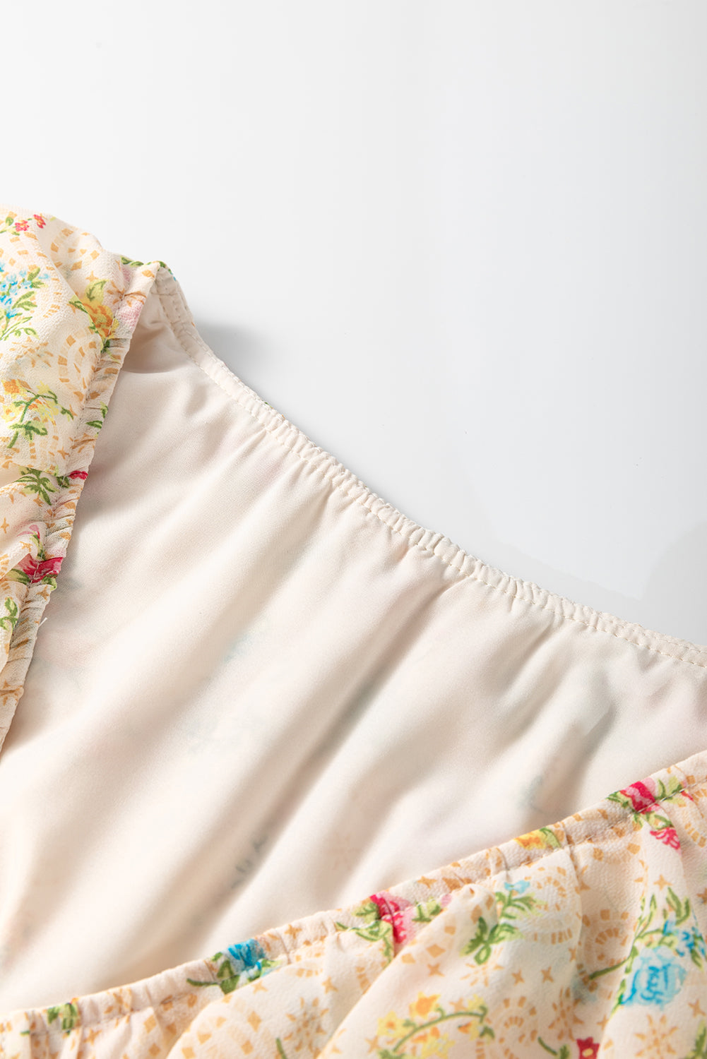 Apricot Boho Floral Tassel Tie V Neck Ruffle Wide Sleeve Mini Dress