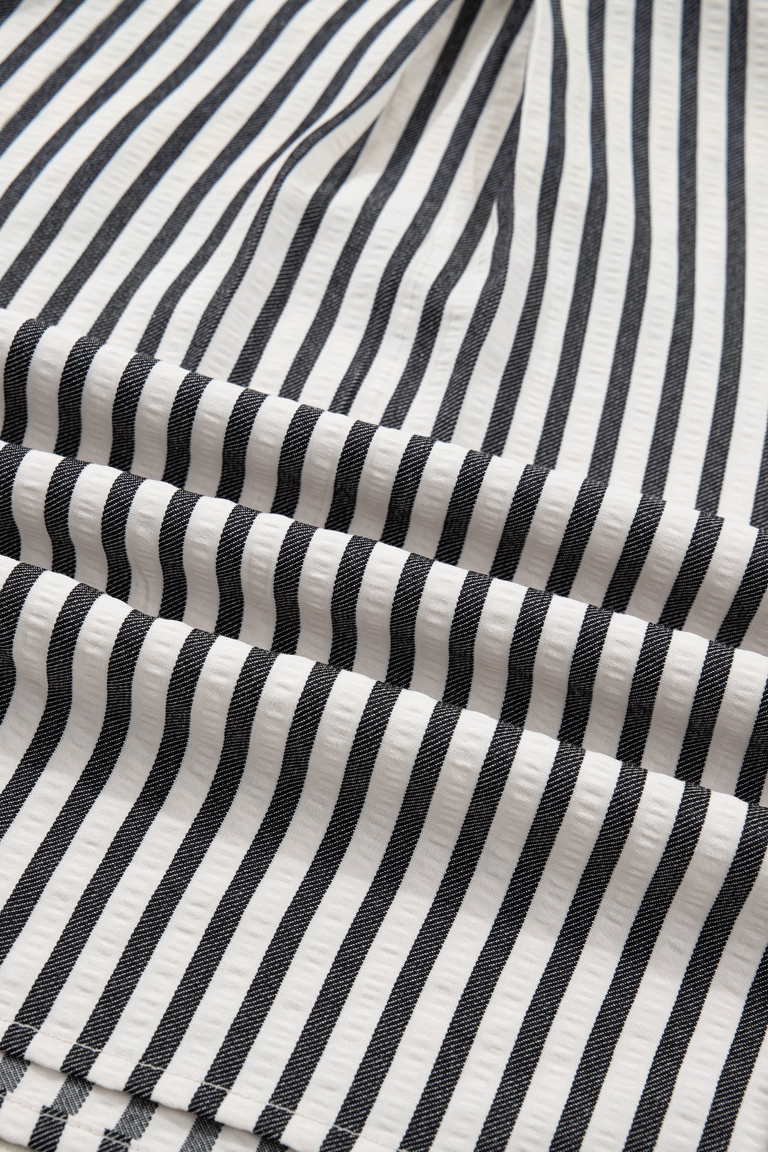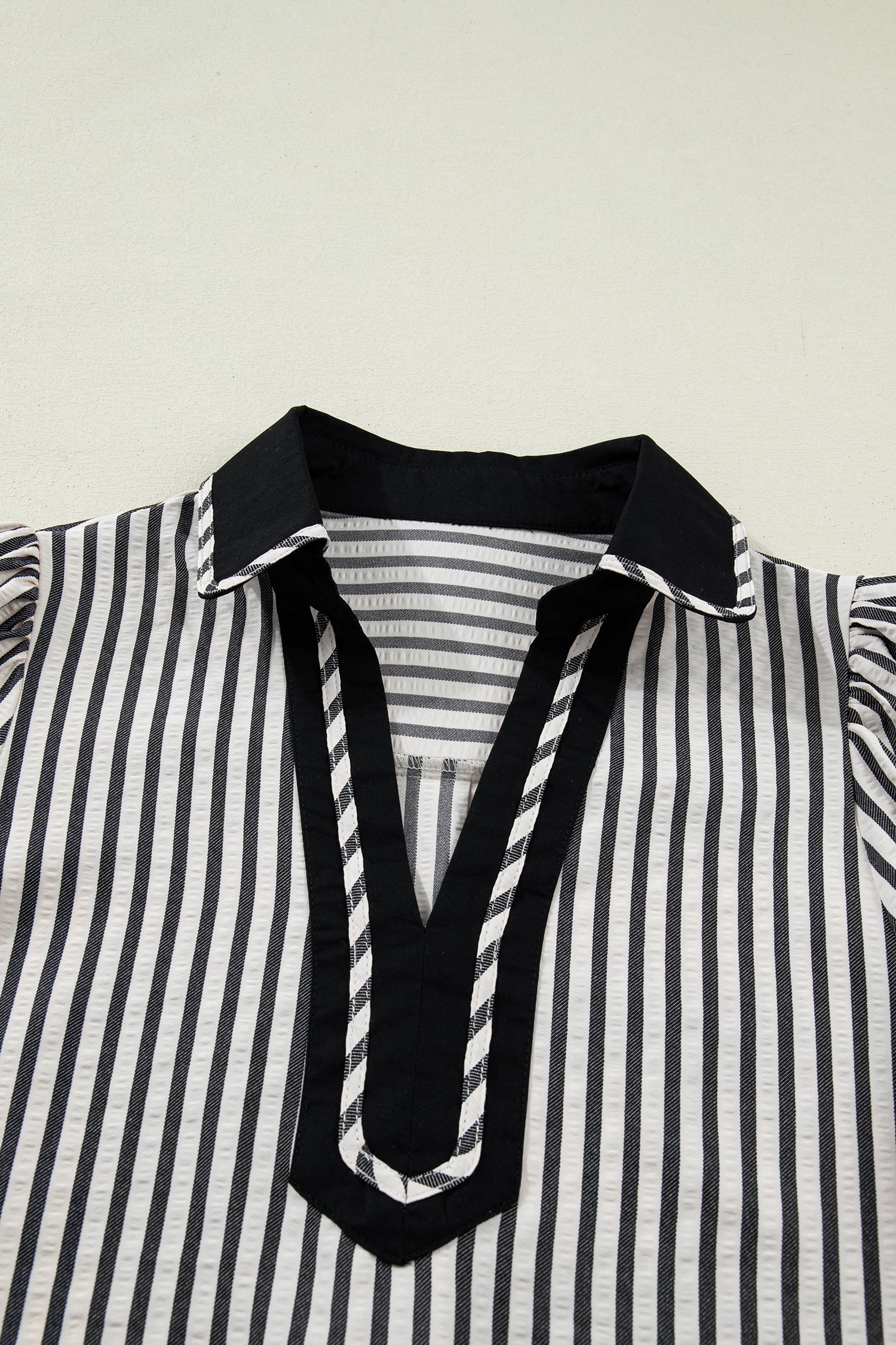 Black Stripe Collared Split Neck Short Bubble Sleeve Blouse