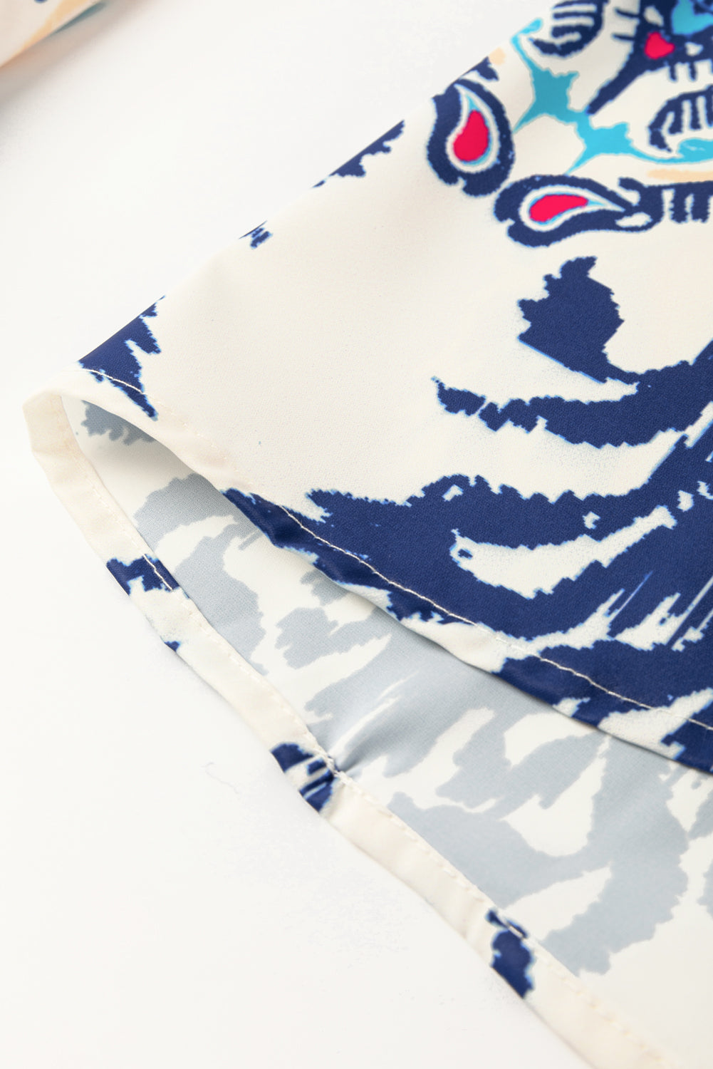 Blue Ethnic Print Striped Split Neck Long Sleeve Flowy Mini Dress