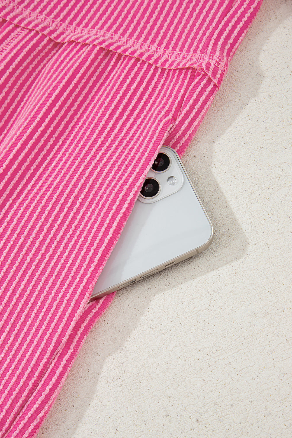 Bright Pink Spiral Ribbed Short Sleeve V Neck Buttoned Romper with Pocket